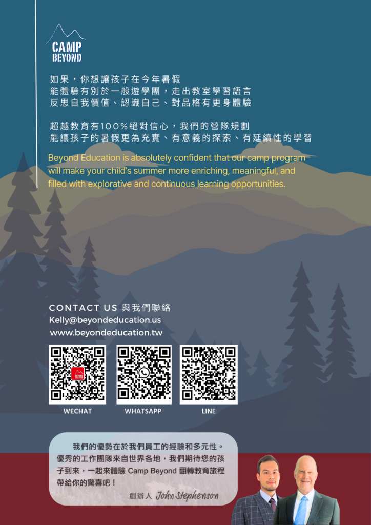 由擁有12年升學輔導經驗的專業顧問親自擔任營隊導師。超越教育是重於青少年品格塑造與價值觀探索的海外營隊。透過大自然挑戰、學術與職涯體驗、與當地美國高中生共同參與、沉浸式全英環境,讓學生真正融入在地文化,深入體驗在台灣無法接觸的人事物!由10年經驗升學輔導顧問領導,也非常適合作為學生美國大學升學的試探,了解美國教育精神與環境的適合度。