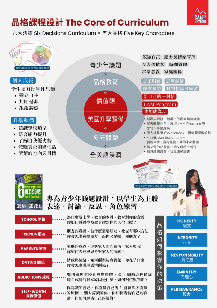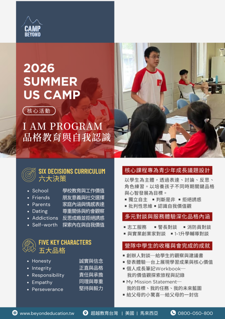 營隊以 I AM Program 為主軸,專為青少年設計,強調表達、討論、反思與角色實踐。透過 SIX DECISIONS 六大決策 與 FIVE KEY CHARACTERS 五大品格的系統課程,引導學生探索自我價值觀,建立正確的人格發展與道德觀念。
