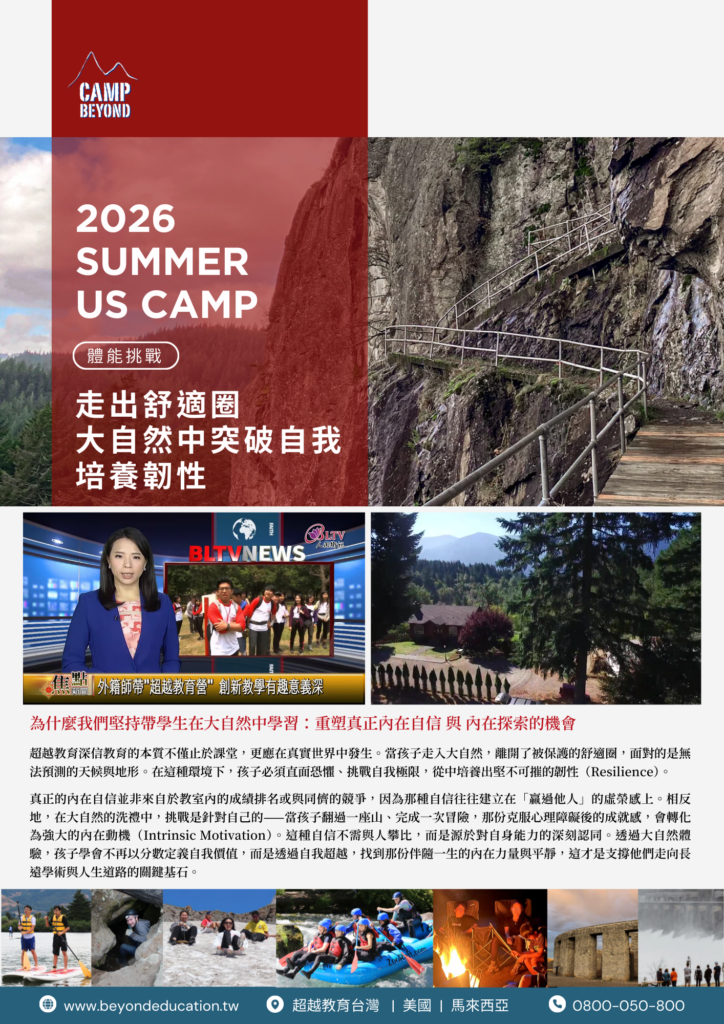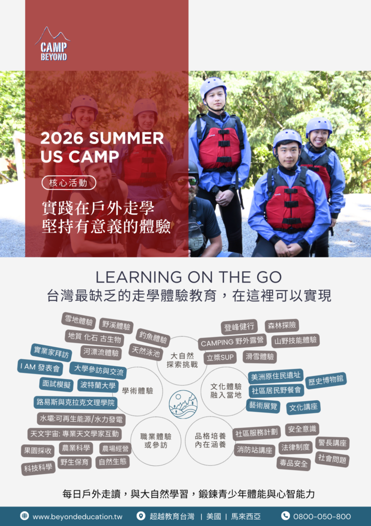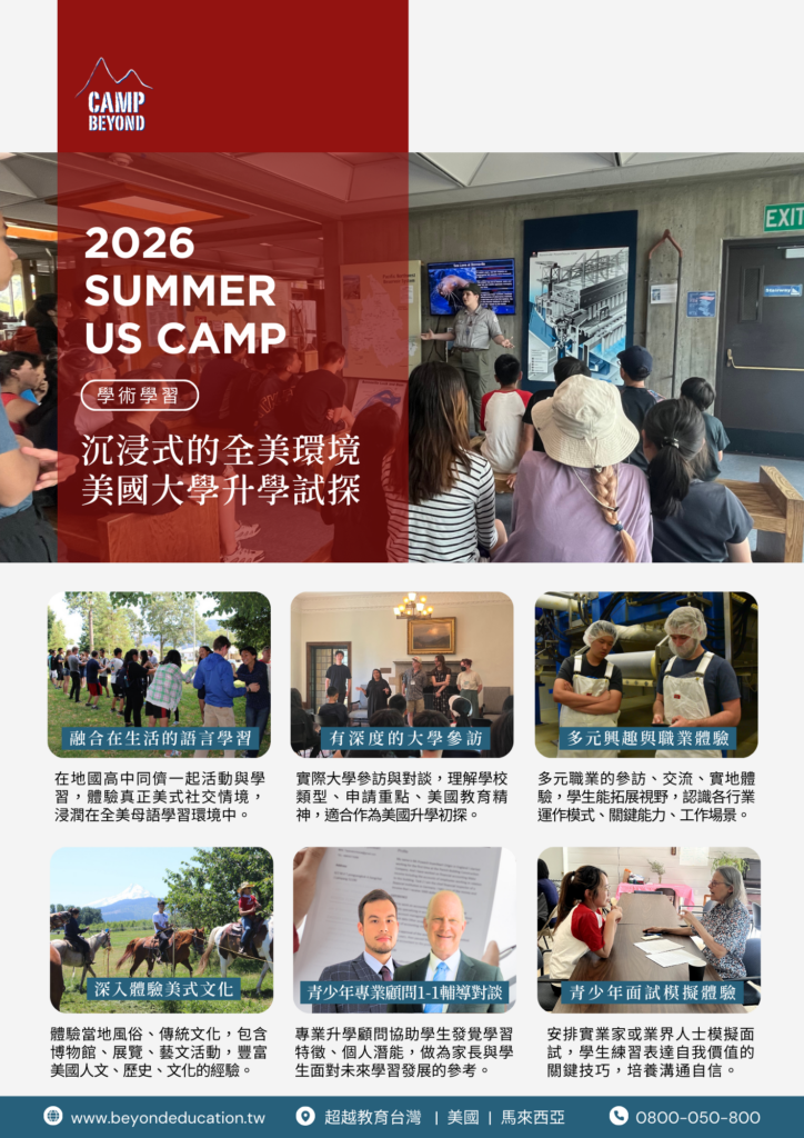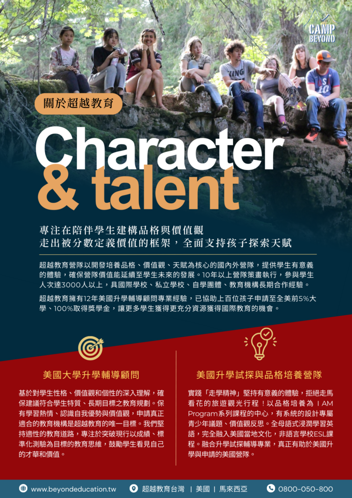 由擁有12年升學輔導經驗的專業顧問親自擔任營隊導師。超越教育是重於青少年品格塑造與價值觀探索的海外營隊。透過大自然挑戰、學術與職涯體驗、與當地美國高中生共同參與、沉浸式全英環境,讓學生真正融入在地文化,深入體驗在台灣無法接觸的人事物!由10年經驗升學輔導顧問領導,也非常適合作為學生美國大學升學的試探,了解美國教育精神與環境的適合度。
