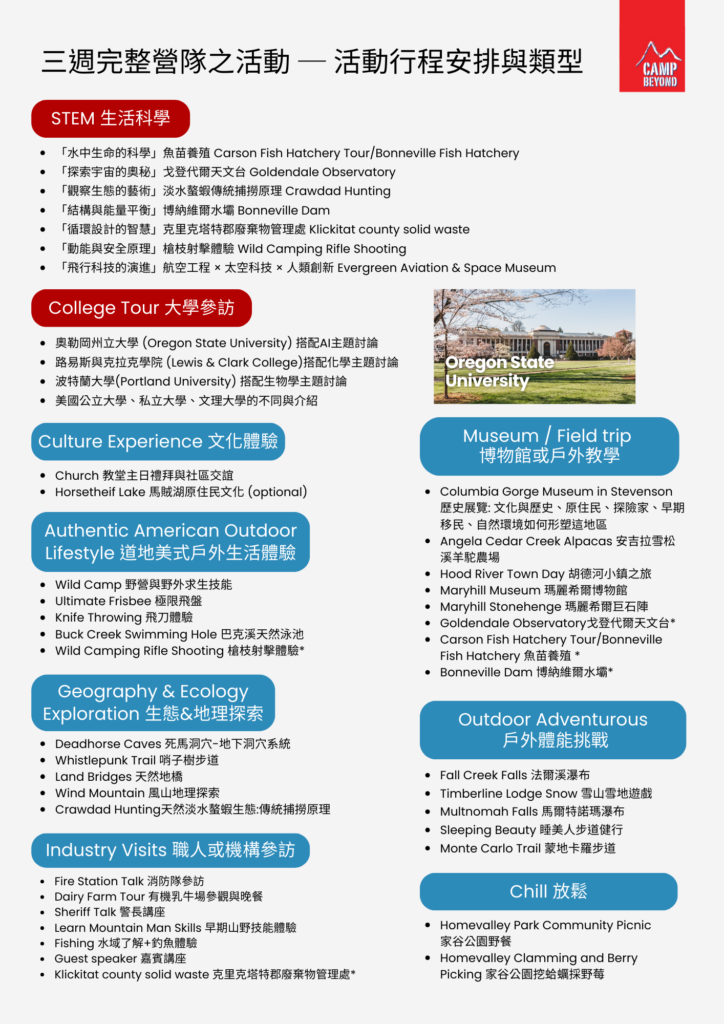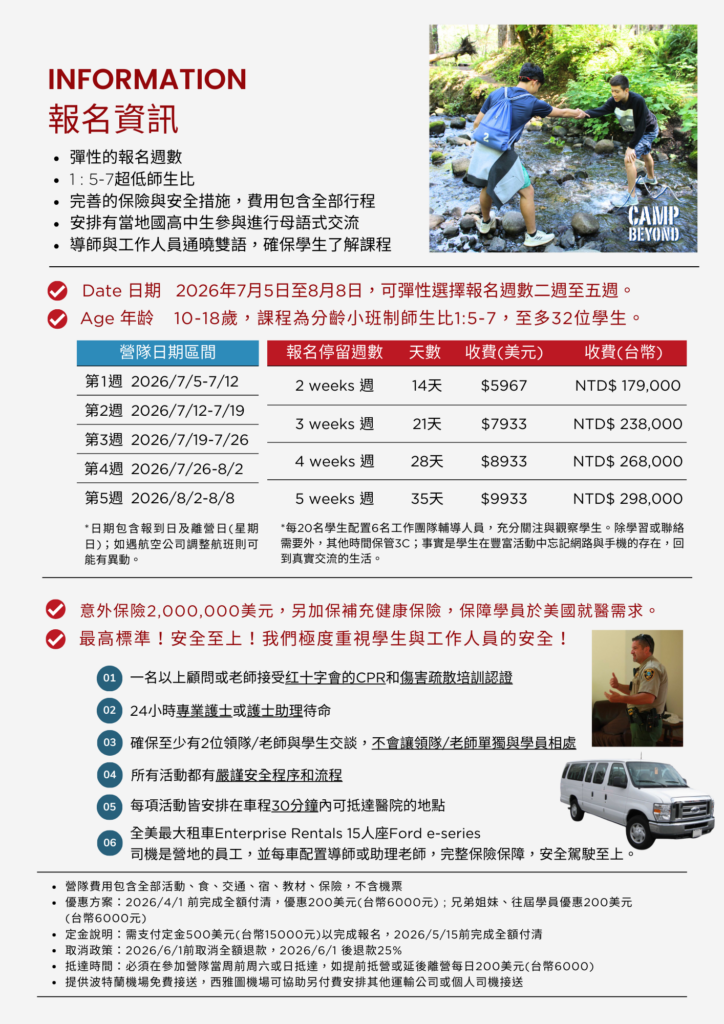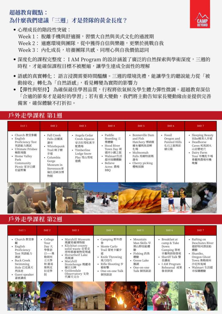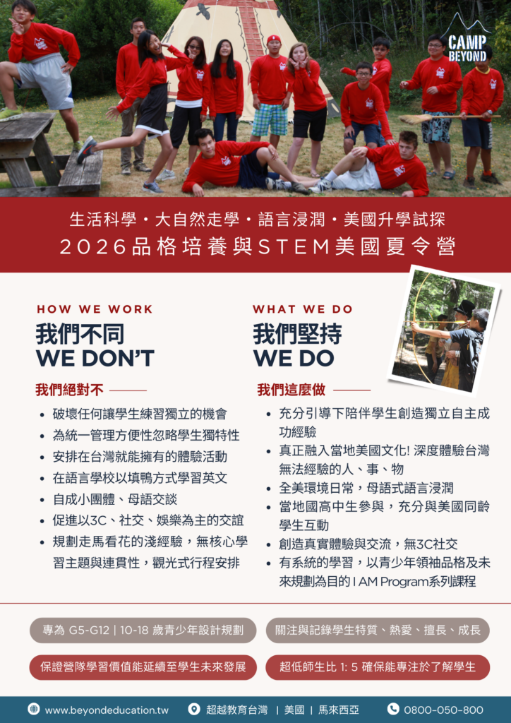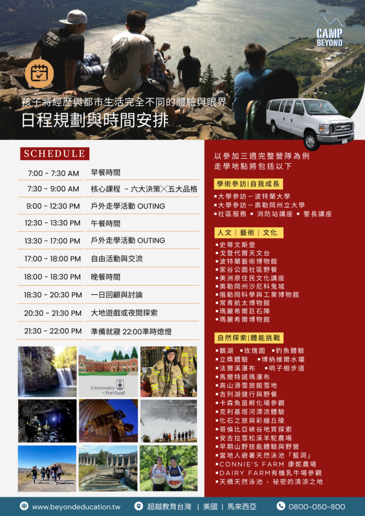 由擁有12年升學輔導經驗的專業顧問親自擔任營隊導師。超越教育是重於青少年品格塑造與價值觀探索的海外營隊。透過大自然挑戰、學術與職涯體驗、與當地美國高中生共同參與、沉浸式全英環境,讓學生真正融入在地文化,深入體驗在台灣無法接觸的人事物!由10年經驗升學輔導顧問領導,也非常適合作為學生美國大學升學的試探,了解美國教育精神與環境的適合度。