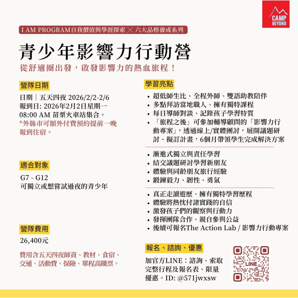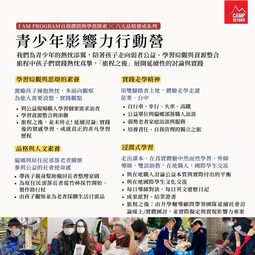 【Idea to Impact】是專為 13–18 歲青少年設計的影響力行動營,以「實踐家精神」為核心。