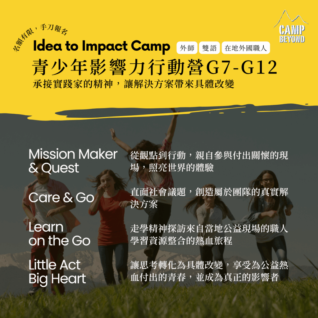 >  2026 Winter Camp【Idea to Impact |雙語 G7-G12 青少年影響力行動營 | 品格教育╳走讀╳公益服務 | 希望實踐家】