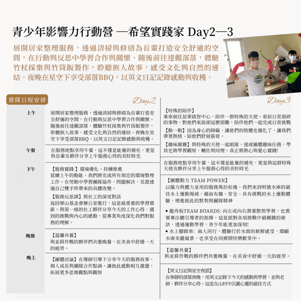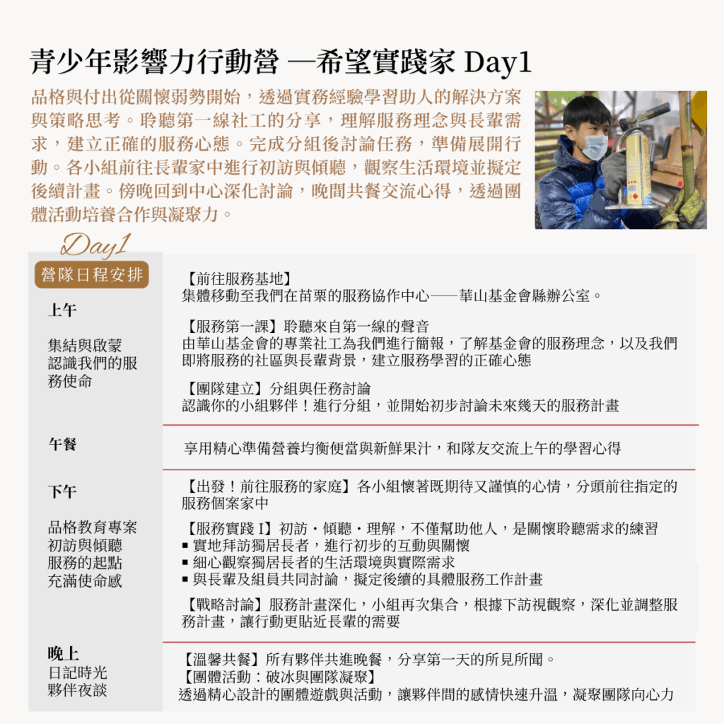 在服務與反思的過程中,學生體會責任與關懷的真實意義,學習如何運用團隊力量解決問題、共同完成任務。這是一場結合思考與實踐的成長歷程,讓青少年從關懷出發,以行動回應社會,在理解與改變中成為勇於行動、帶來希望的【希望實踐家】。